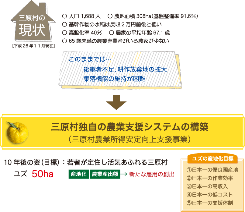 三原村は、標高120mの中山間地域にあり、昼と夜の寒暖の差が大きくゆず栽培に最も適した環境にあります。
